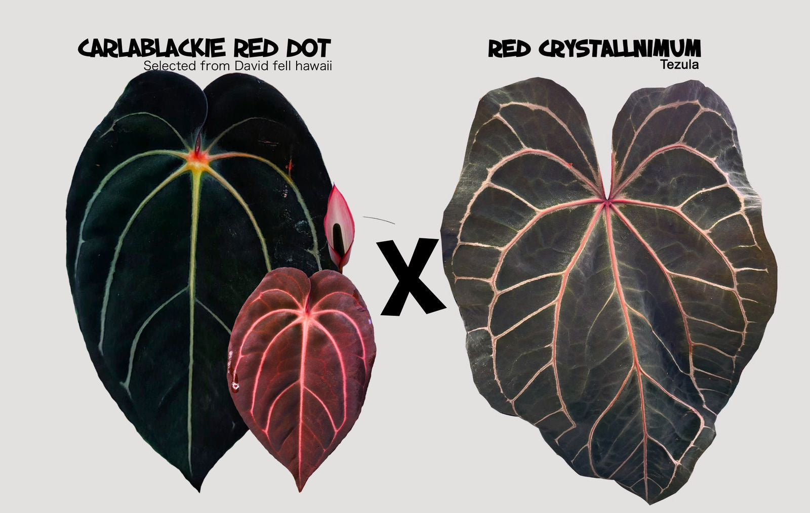 Introducing Anthurium Carla Evenstar — a breathtaking hybrid created by our partner Letoro Jardin from Vietnam. This cross brings together two truly remarkable parents: the mother plant, a selected Carlablackiae from David Fell (Hawaii) known for its distinctive red spot on the sinus, and the pollen donor, the Red Crystal from Tezula Plants, admired for its bright, colourful emergents and refined form.