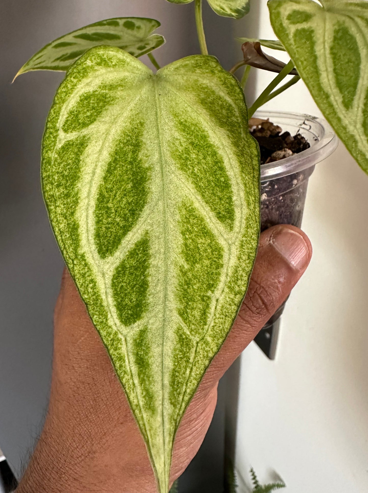 Ce qui rend cet Anthurium vraiment spécial, c'est sa panachure : un mélange fascinant de verts panachés mentholés qui créent un contraste saisissant dans chaque feuille.