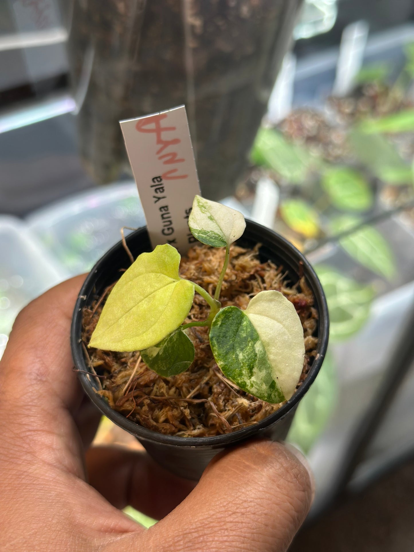 The mother plant, renowned for its exceptional variegation, brings a touch of elegance, while the pollen donor, Papillilaminum Guna Yala, adds robustness and charm. Together, they create a captivating plant that is sure to be a standout in any collection.